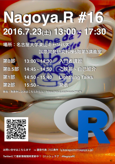 Nagoya.R #16 いよいよNagoya.R #16が明日となりました。飛び入り参加も大歓迎です。 https://atnd.org/events/78674 共有: クリックして X で共有 (新しいウィンドウで開きます) X Facebook で共有するにはクリックしてください (新しいウィンドウで開きます) Facebook クリックして Pocket でシェア (新しいウィンドウで開きます) Pocket いいね 読み込み中… 関連