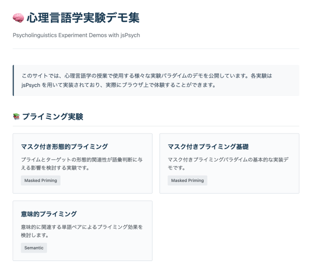 私は,所属先の関西大学外国語学部で,3・4年次生向けに「心理言語学研究」という講義科目を担当しています。本講義では,心理言語学で参照される代表的な実験について,授業中に学生自身がコンピューター上で体験できるようなデモを用意しています。その実験デモはjsPsychを用いてブラウザ上で動作する実験になっていますが,いくつかの実験素材をまとめた「デモ集」のページをまとめたので,URLを公開します。