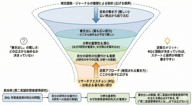 次にもう1つ。漏斗の一番上から書こうとすると難しいのは,どの広さから書き始めるかが決まっていないからです。一方で,論文を書き始める時点で,RQと規定の語数は決まっているはずです。となると,RQが漏斗の一番狭い部分ですから,ここから徐々に広げていくほうがスタート地点が固定されていて書きやすいです。