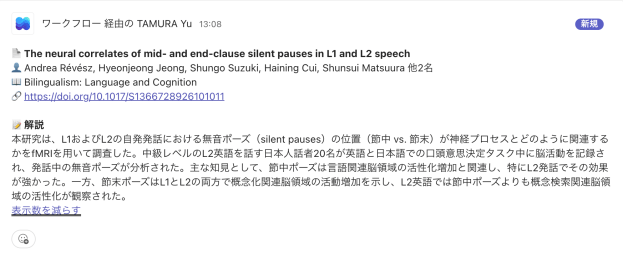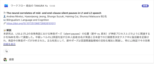 私はゼミではDiscordではなくTeamsを使っているので,Teamsで同じことができないかと試してみたところ,できました。Gemini APIの無料枠を使えば,論文の日本語解説まで自動生成して一緒に投稿できます。とはいえ,ウェブで取ってこれる情報に依存するので,論文全体を読んでの解説ができるものとできないものに分かれるのかなとは思います。「解説」は今の段階ではアブストの日本語訳って感じですね。