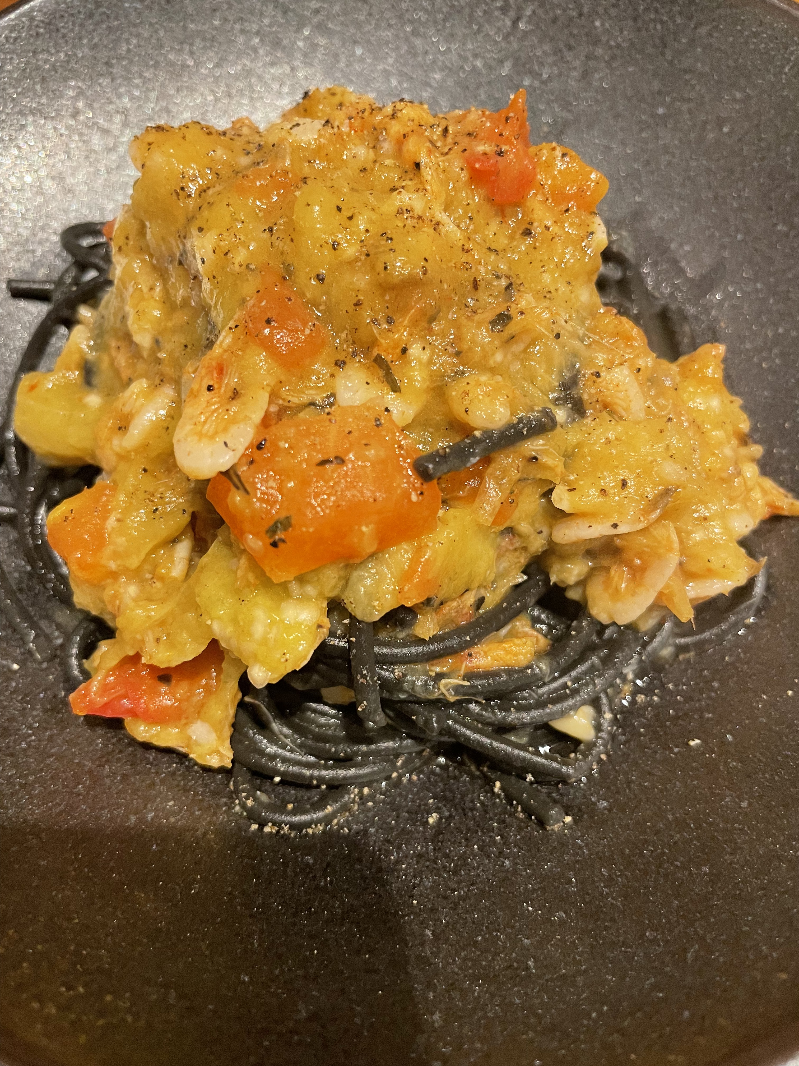 麺はイカ墨が練り込んであるものだということでした。ただ,そんなものは普通は手に入らないので,スーパーで売ってる麺(DE CECCO No.11)でトライすることに。また,黒七味も手に入りませんでした。そこで,ニンニクをしっかり使うことと,イタリアンパセリを使うことでアーリオ・オーリオの方向性で仕上げることにしました。