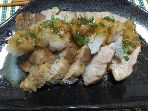 たったこれだけです。今回は自家製の豚バラチャーシューを作って載せています。これは豚バラブロック(たまたまスーパーで安かった)を酒,生姜,にんにくと一緒に茹でて脂を落として,醤油と味醂を1:1で混ぜたつけ汁を入れたボールの中でぐるぐる回しながらまんべんなく染み込ませておきます。これは前日の夜にやっておいて,食べる前にオーブンで片面ずつ焼色をつけて,またつけ汁をつけて反対側も焼くという感じで焼色をつければ完成。別にチャーシューは買ってきてもOKですし,メンマとかもうまいでしょう絶対。ポイントは調味料のおろしニンニクですかね。にんにく苦手な方はこれなしでもOKですが,ちょっと物足りなさを感じると思います。