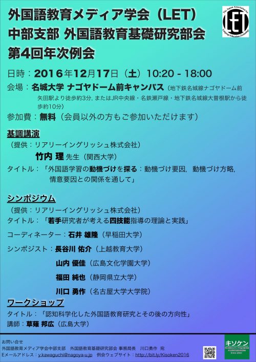 今週土曜日12月17日に,名城大学ナゴヤドーム前キャンパスにて,外国語教育メディア学会(LET)中部支部 外国語教育基礎研究部会第4回年次例会が開催されます。皆様,奮ってご参加ください。