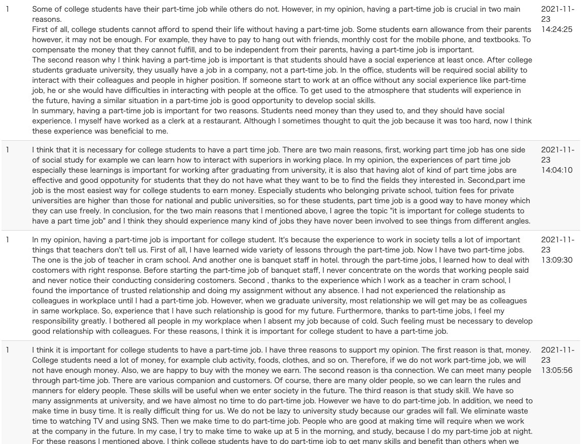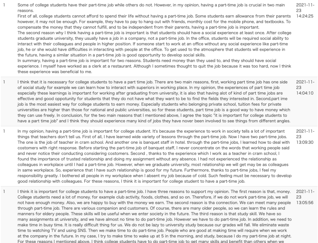 例えば,過去記事で紹介した『Getting Things Done [Book 1] Tasks for Connecting the Classroom with the Real World』(GTD)のUnit6 “Daily scenes”では,最後の活動で自分の学校の中のある場所を描写するライティングの課題が設けられています。この描写課題は教科書に書き込むスペースが設けられていますので,授業内で他の学習者の書いたものを読む機会を与えたりしない限りは共有ができません。じゃあ,ということで,これは教科書に書かせずにLMS上でタイプして提出させる宿題にすることにしたとします。こうすることで,例えば下の画像のような形で他のクラスメイトの書いたものを一覧で見ることができるようになります。