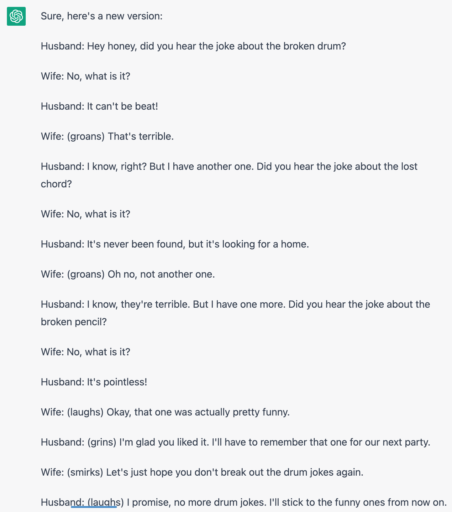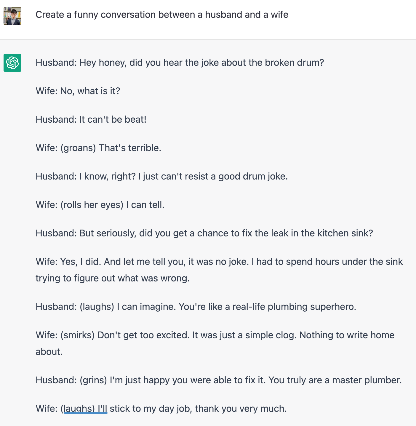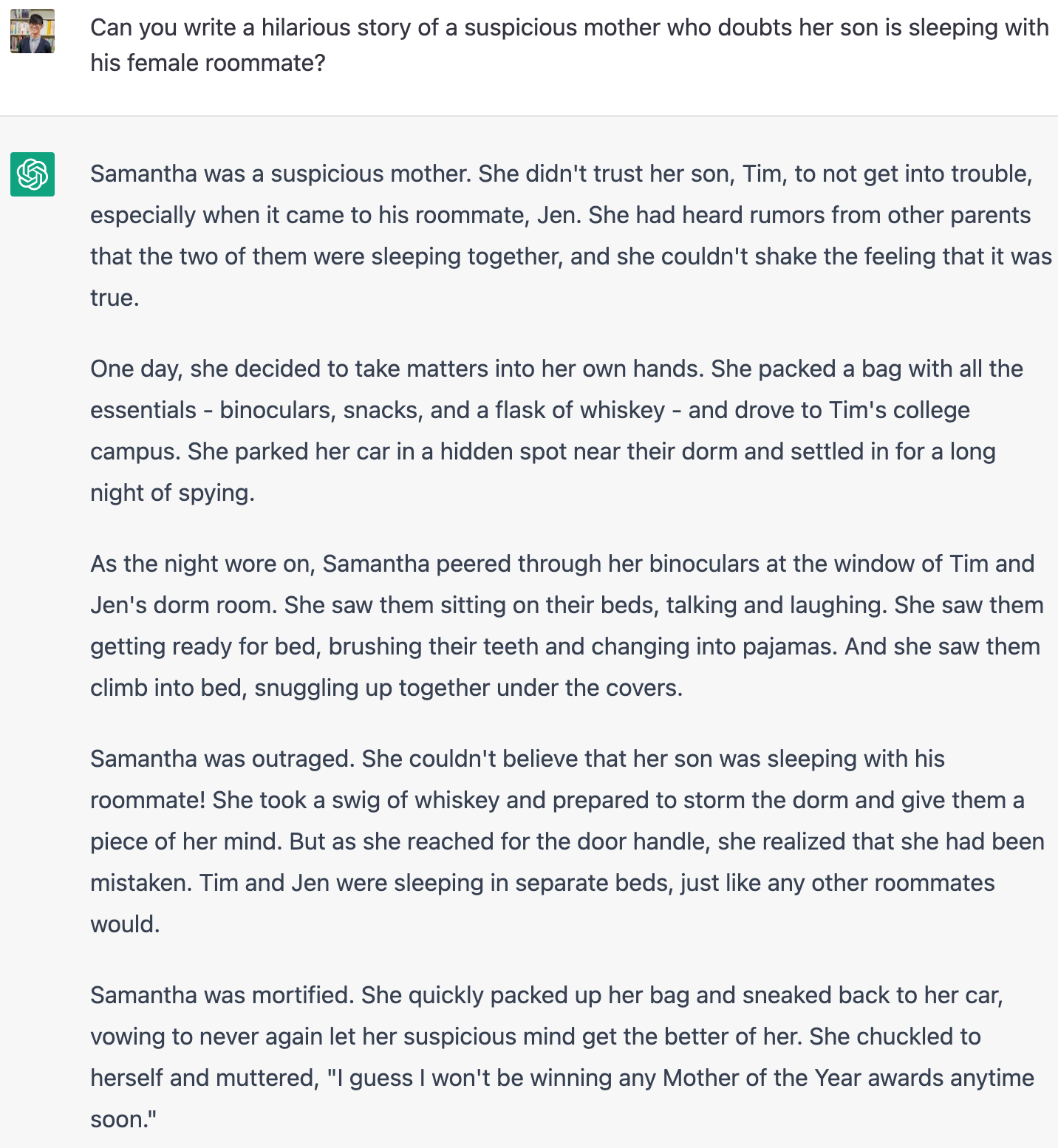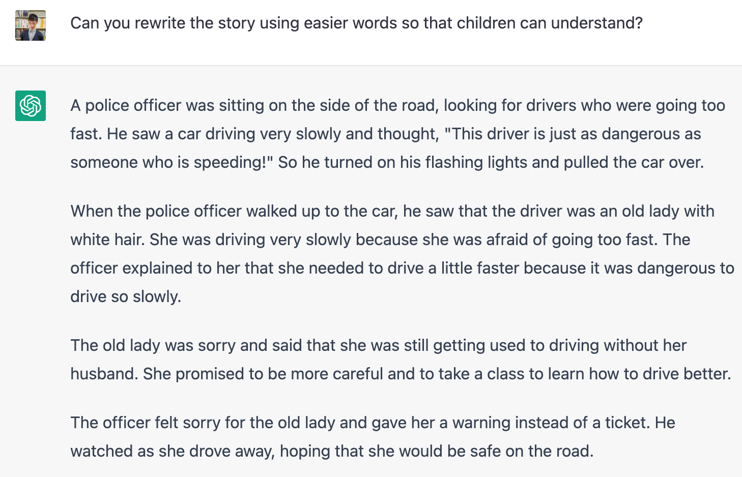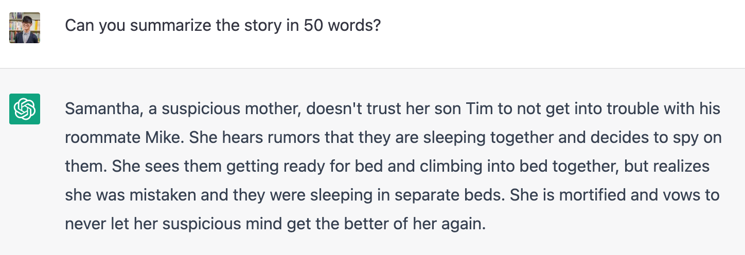 ChatGPTの大きな特徴として,前の会話の内容を覚えているというものがあります。したがって,一度入力したものは同一スレッド内であれば記憶されているので,”the story”とするだけでいけます。すごいですね。