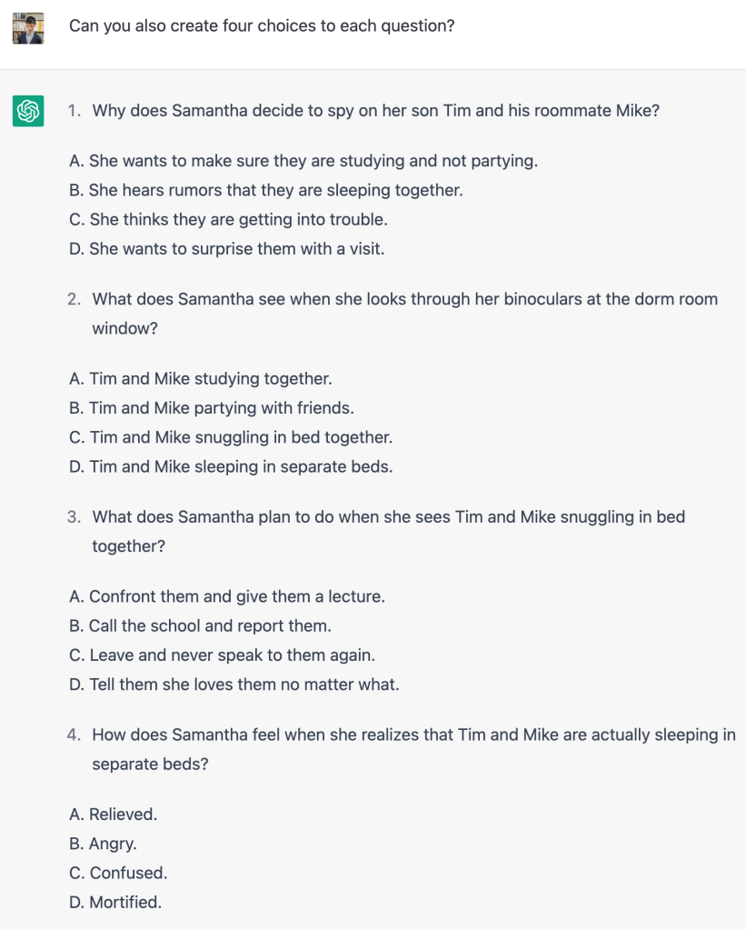 1と2の問題が関連しているどころか,2の正答が3の選択肢に含まれていることなど,テスティング的には全然いい問題だとは言えないですね。また,4も物語のオチを言っちゃっている上に,正答は元の文章に使われている単語そのものです。このあたりは,人間の手で修正を加えなければいけないでしょう。あるいは,人間が作成する問題のほうが(少なくともテスト問題作成に熟知した人であればですが)上だと言えそうです。テスティング・評価関係の授業で,この問題の何がいけないのか,自分ならどのように作り変えるのかなどを学生に考えさせる課題のネタとしては良い教材かもしれません。
